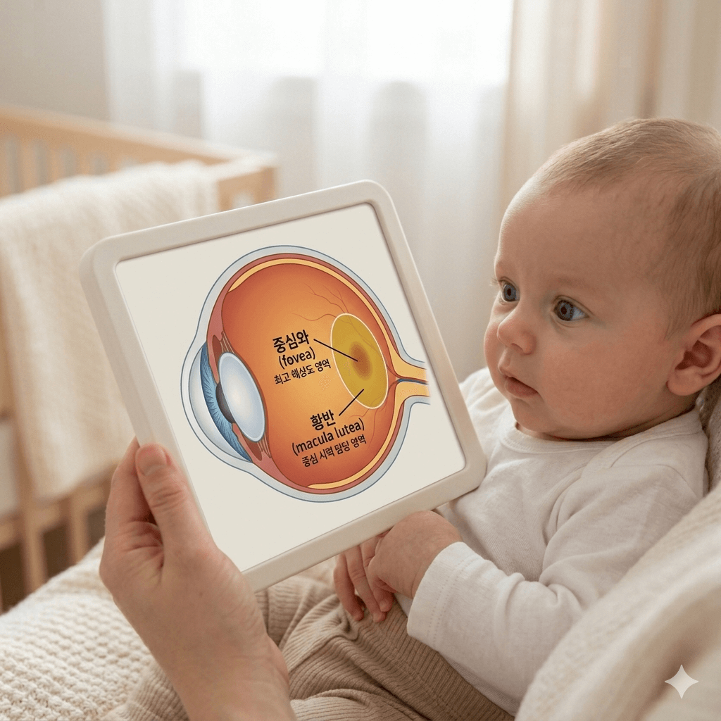 많은 분들이 궁금해하시는 부분이 "우리 애는 왜 이렇게 초점이 없어 보이지?"인데요. 이건 수정체 조절 근육이 아직 약하기 때문입니다. 성인은 수정체를 조절해서 가까운 물체와 먼 물체를 번갈아 또렷하게 볼 수 있지만, 신생아는 이 능력이 거의 없습니다.
